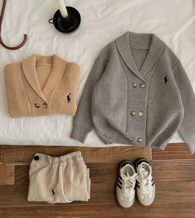 Детский свитер-кардиган 2025 года, осень-зима, новый, для мальчиков и девочек, модный бренд, вышивка, иностранный стиль, универсальный вязаный свитер, куртка.