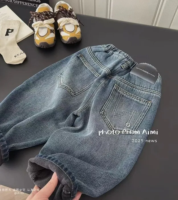 Джинсы с флисовой подкладкой для мальчиков и девочек корейский стиль, джинсы Dad, модные, теплые, длинные брюки 2025.