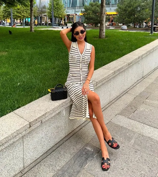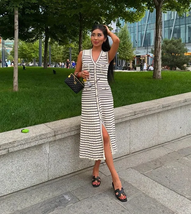 Французское элегантное платье без рукавов с V-образным вырезом и пуговицами от Сандра
