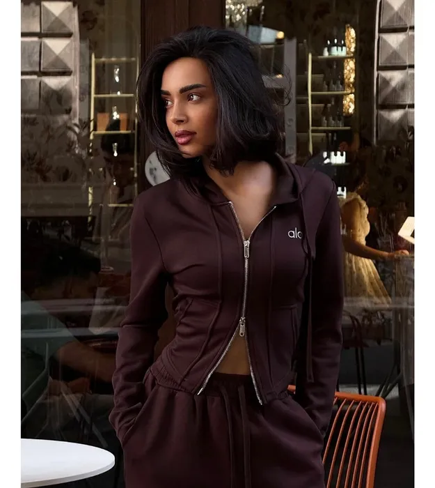 Новейший костюм от Alo, куртка с длинными рукавами, капюшоном и принтом логотипа, застежка на молнию + повседневные брюки на резинке.