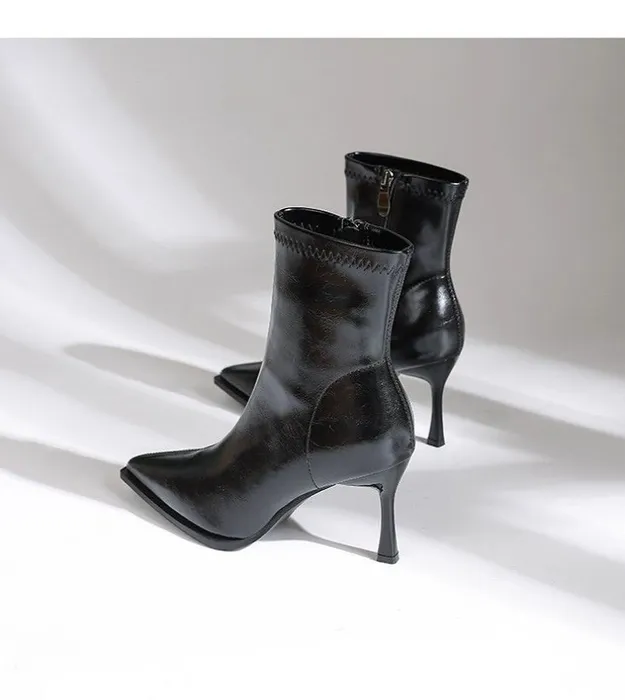 Женские зауженные сапоги с острым носком, эластичные, 2025, новый осенне-зимний стиль, элегантные ботильоны на шпильке с высоким каблуком и боковой молнией.