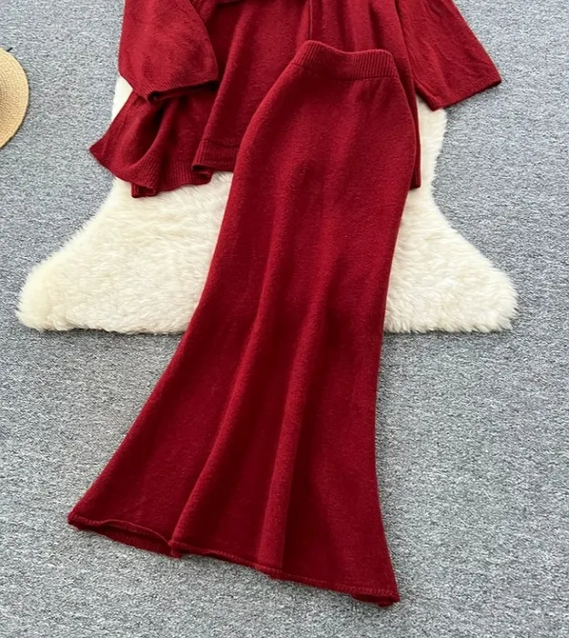 Осенний-зимний комплект в стиле casual для женщин: свободный, универсальный жилет без рукавов с квадратным вырезом в сочетании с трикотажным кардиганом и юбкой.