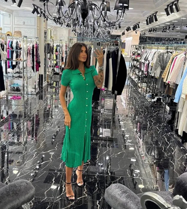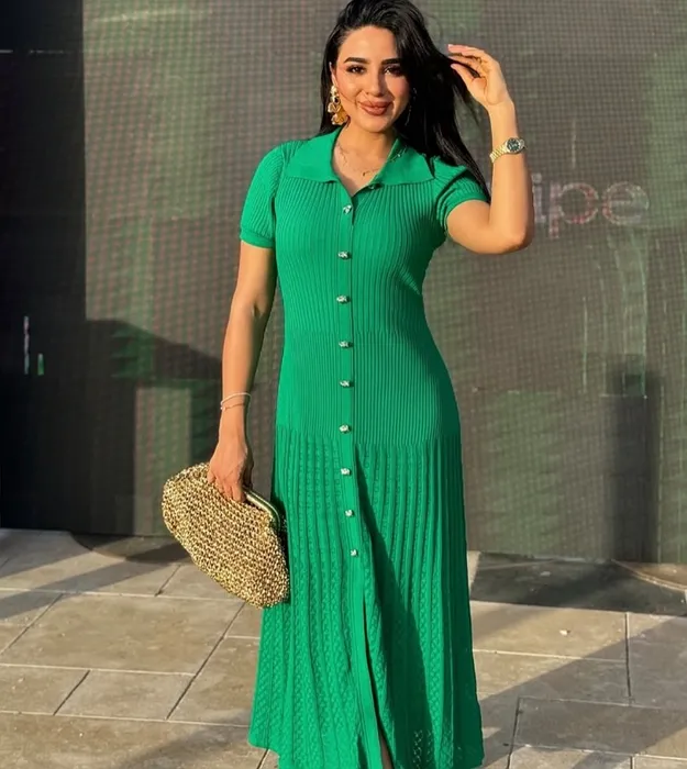 Французское элегантное платье Сандра высокого класса с золотыми цветочными пуговицами, ажурными плиссированными лацканами, трикотажным платьем с короткими рукавами, длинной юбкой.