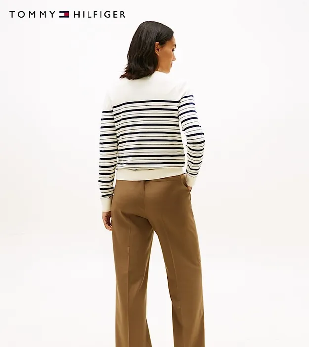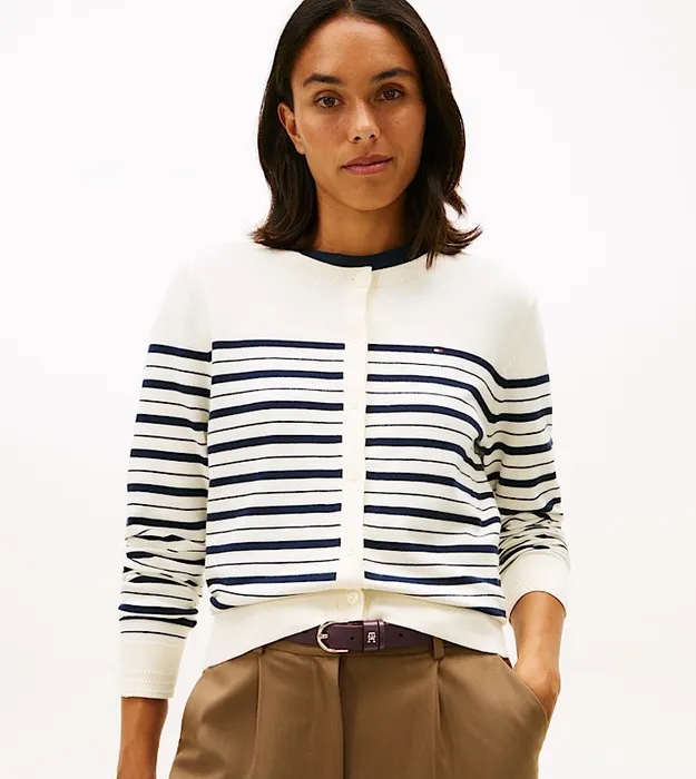 Tommy 26, новая женская элегантная повседневная кардиган-жакет из трикотажа с круглым вырезом и пуговицами, для поездок на работу. Темно-синие и белые полосы.