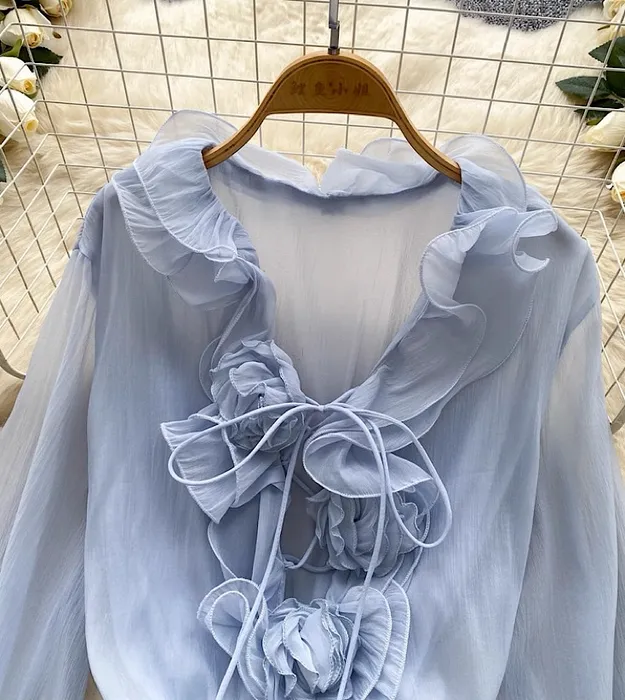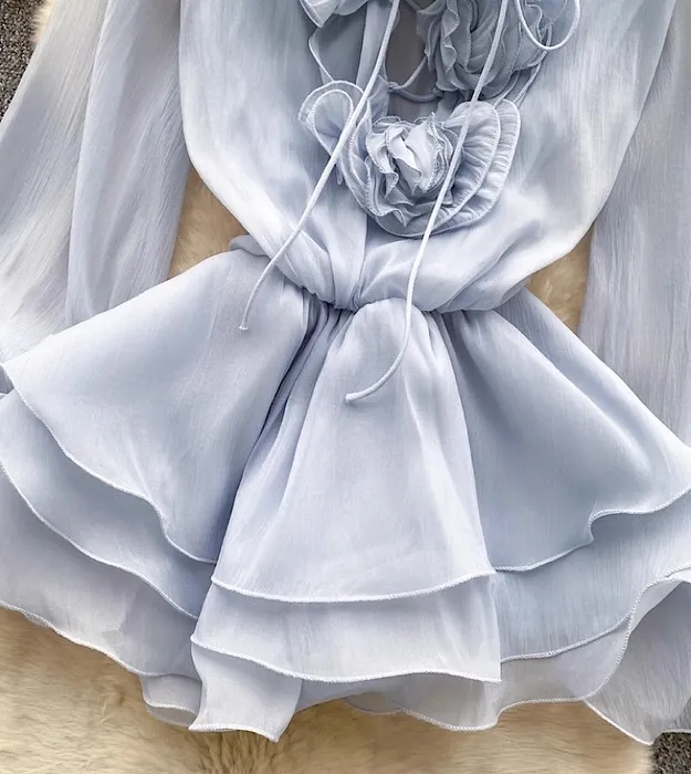 Новый стиль, атмосферное, с V-образным вырезом, объемным цветочным принтом, поясом на завязках и оборками, из шифона, для женщин.