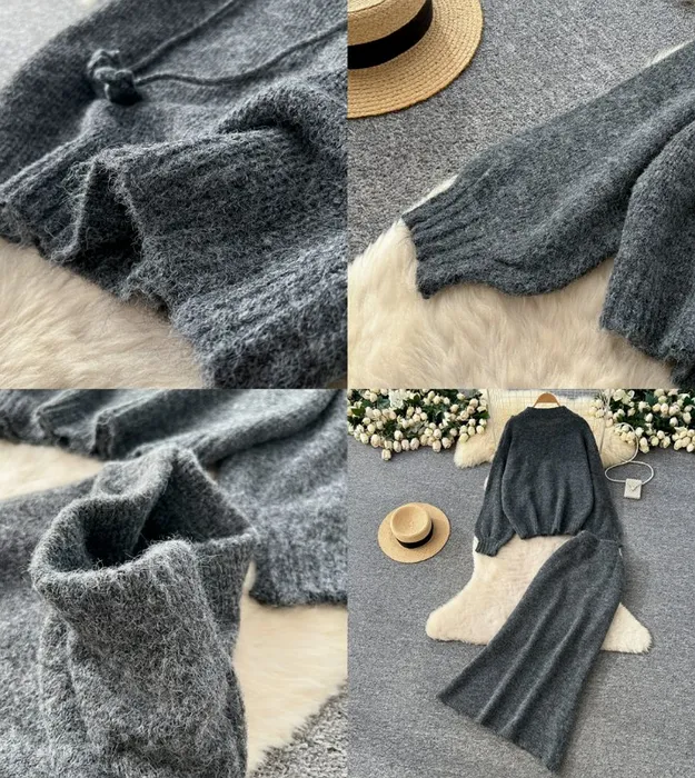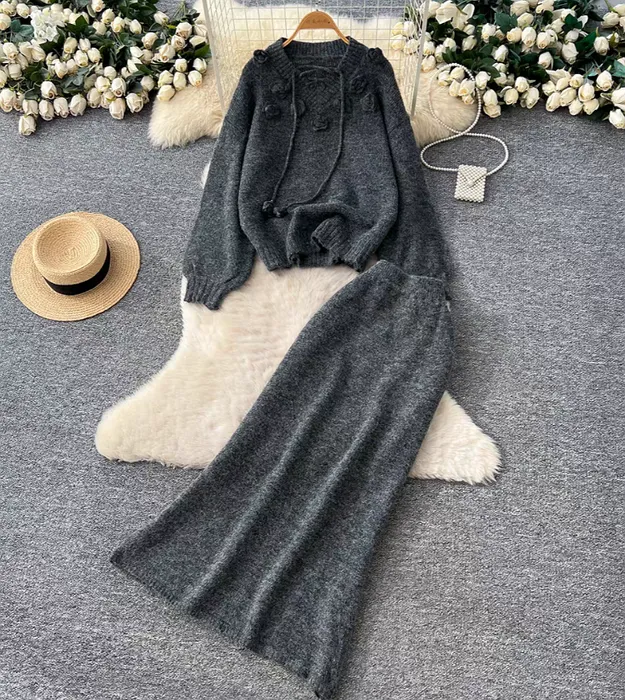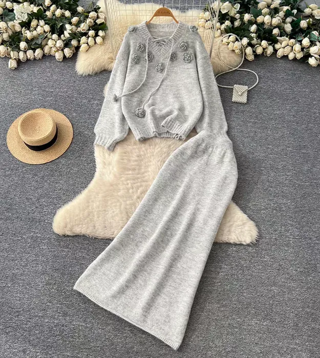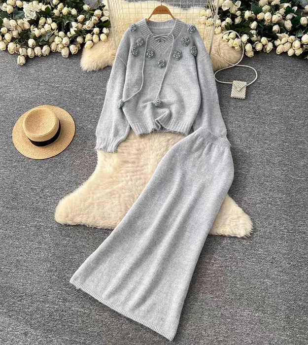 Элегантный женский осенне-зимний комплект из двух частей: мягкий трикотажный топ с объемным цветочным принтом, завязкой на талии, длинными рукавами и облегающей юбкой с высокой талией.