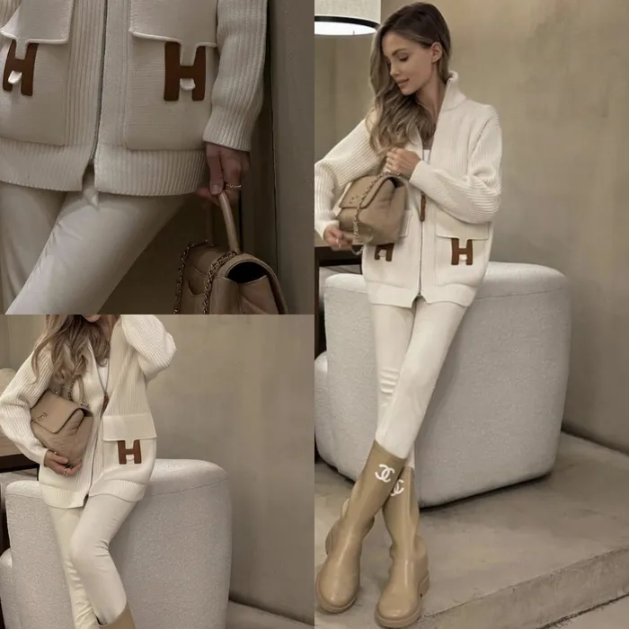 Herme* Новая модель кожаная буква H с двойным карманом с длинными рукавами и вертикальным воротником вязаная куртка-кардиган на молнии.