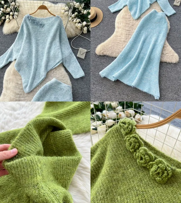 Нежный и женственный стиль осенне-зимнего наряда: свободный, неровной формы, объемный цветочный свитер с трикотажной юбкой на высокой талии, элегантный комплект.