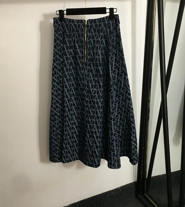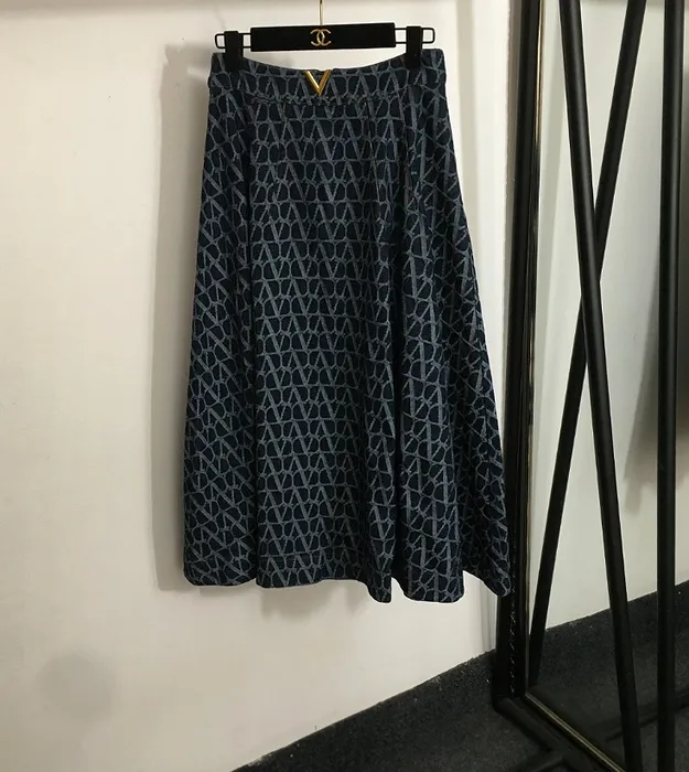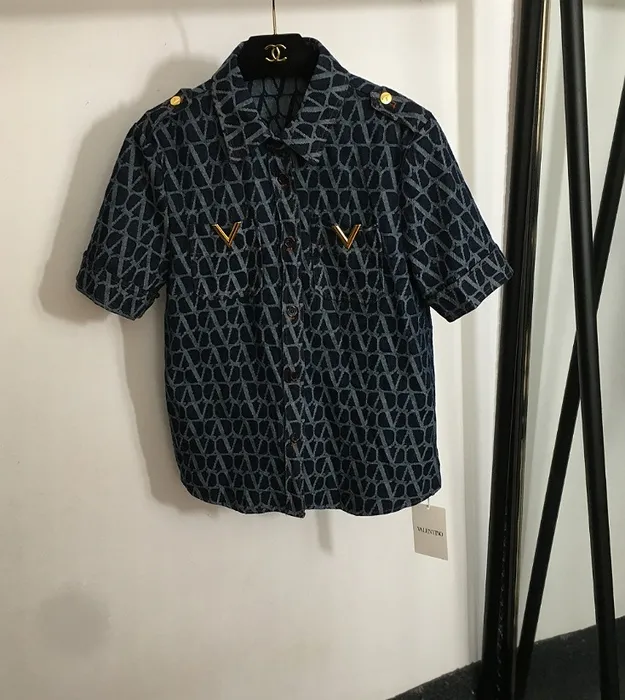 Valentin* новый джинсовый костюм, жаккардовая рубашка с короткими рукавами и буквой V по всей поверхности + джинсовая юбка с завышенной талией