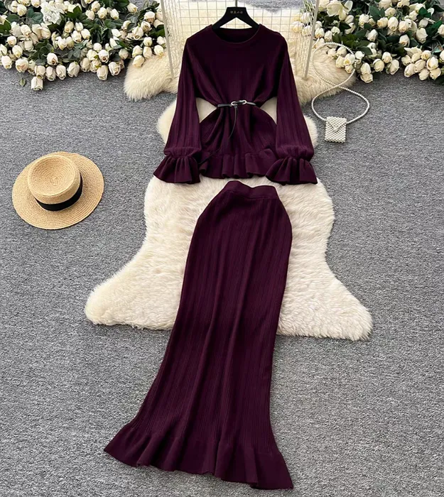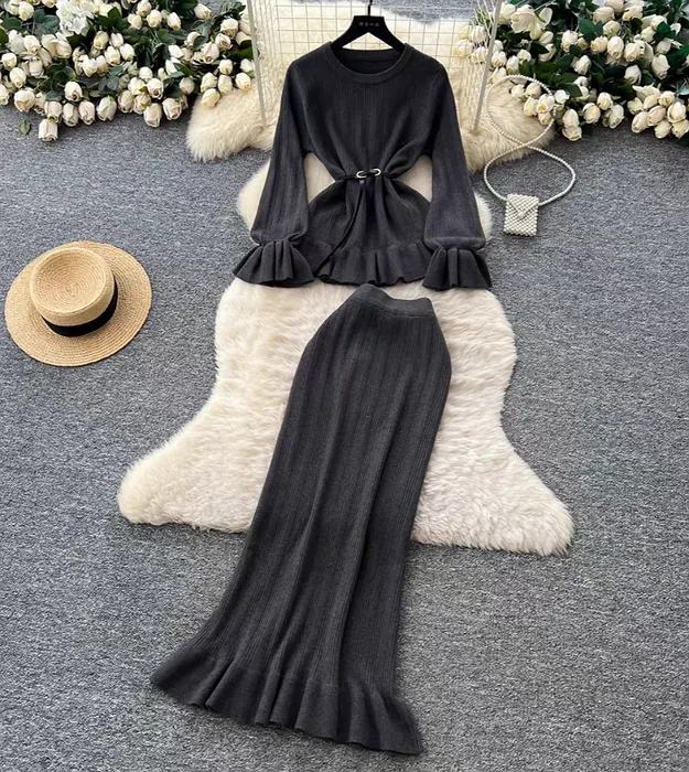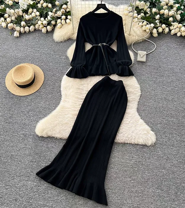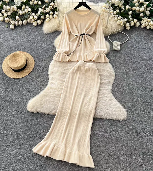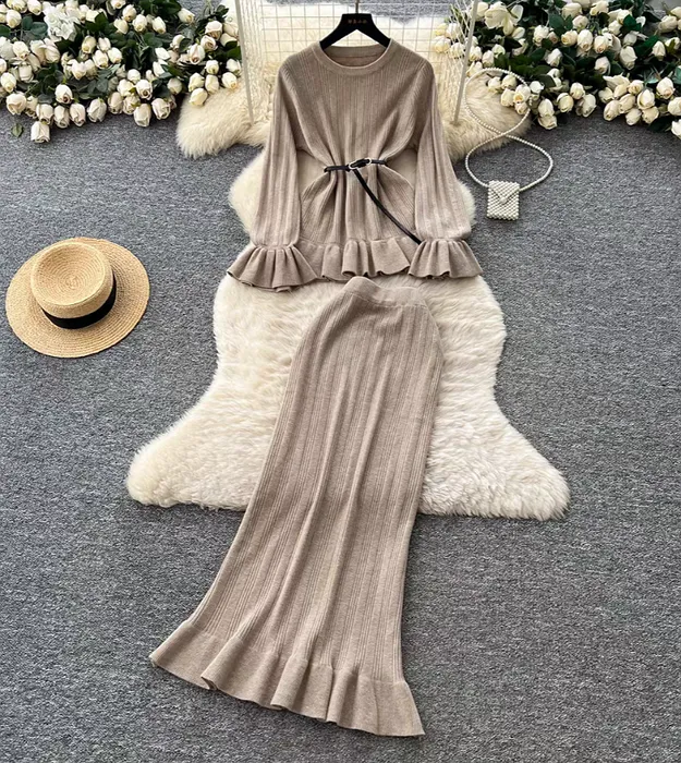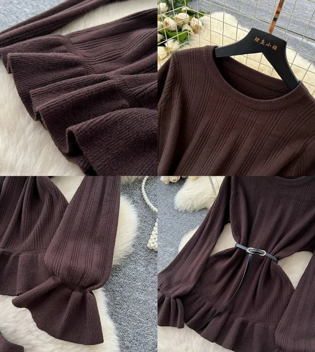 Высококачественный женский свитер для осени и зимы: круглая горловина с завязкой на талии во французском стиле и оборкой по низу, трикотажный верх + юбка.